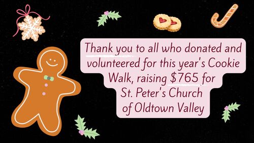 What a sweet success this year cookie walk turned out to be! Thanks to your incredible baking buying volunteering cheerful participation we raised $765 for Saint Peters Church of Old Town valley. This is proof that when our community chips in, Big things happen, one cookie at a time period from the first sprinkle to the last crumb, every single person who baked, donated, helped or came to shop made this event truly special yet again. So start preheating those ovens and saving room on your cookie trays because next year's cookie walk is already shaping up to be even batter! We can't wait to do it all over again together!